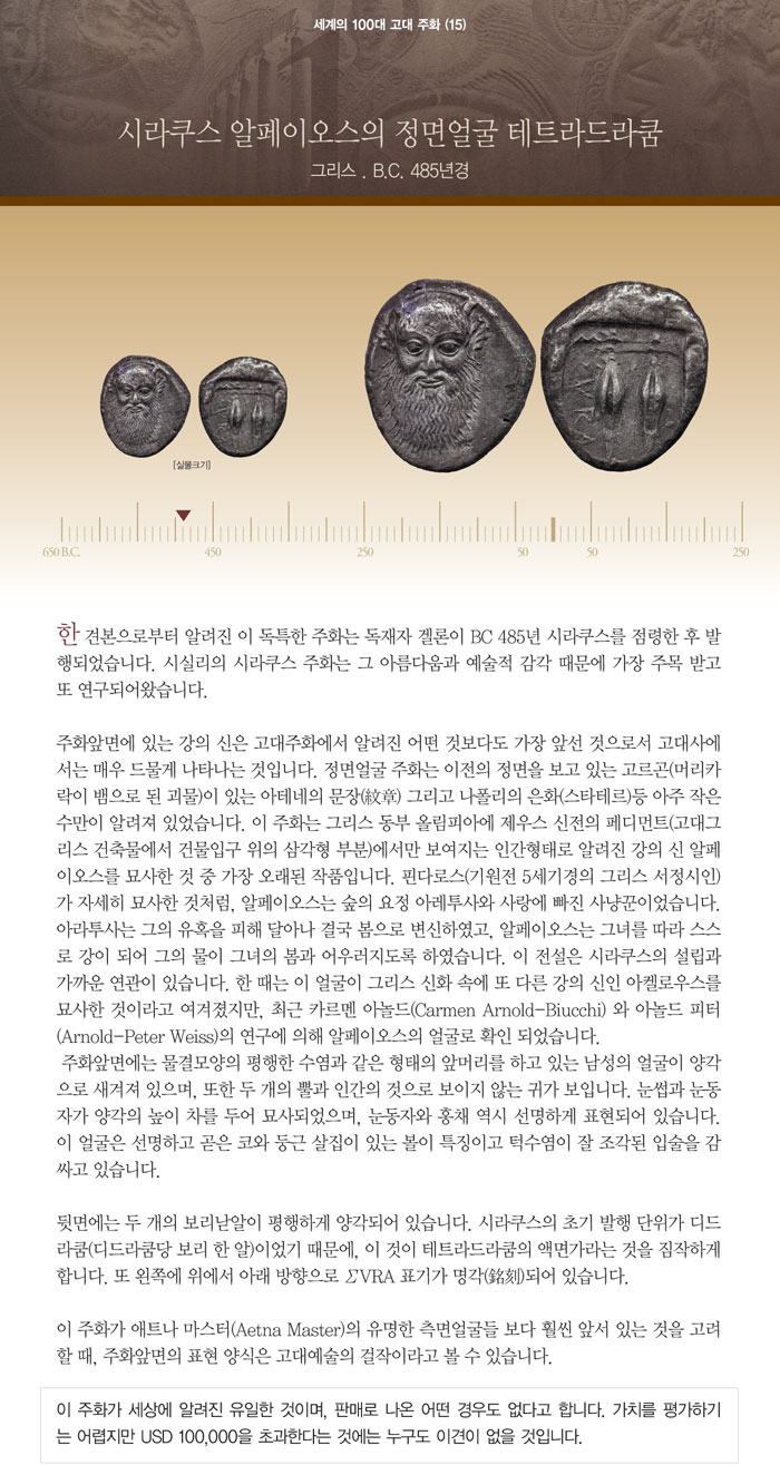 | 세계의 100대 고대 주화 (15) 사라쿠스 알레이오스의 정면얼굴 테트라드라쿰 | |||||