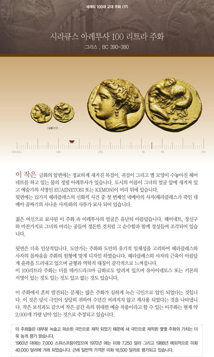 | 세계의 100대 고대 주화 (17) 시라큐스 아레투사 100리트라 주화 | |||||