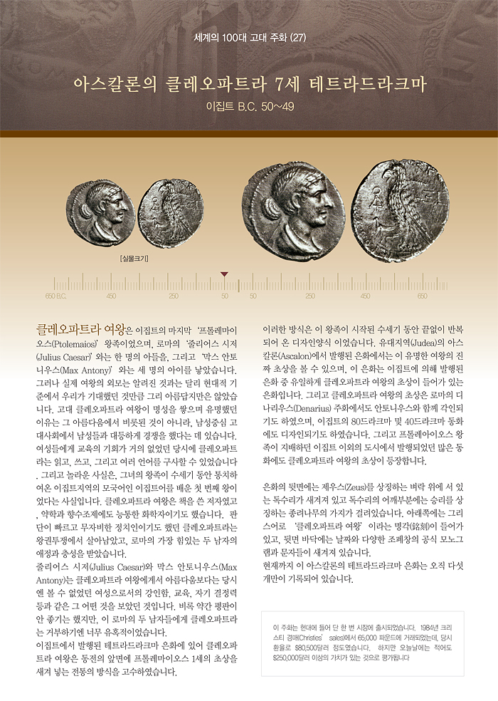 | 세계의 100대 고대 주화 (27) 아스칼론의 클레오파트라 7세 테트라드라크마 | |||||