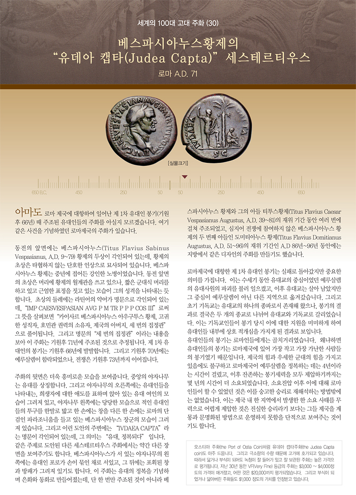 | 세계의 100대 고대 주화 (30) 베스파시아누스황제의 "유데아 캡타" 세스테르티우스 | |||||