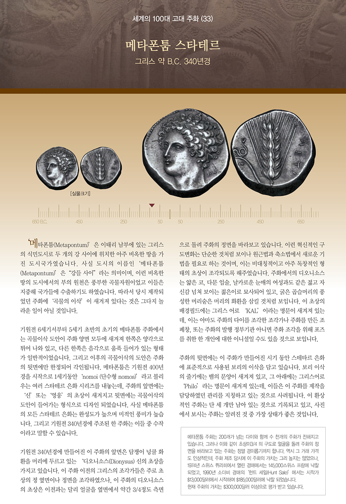| 세계의 100대 고대 주화 (33) 메타폰툼 스타테르 | |||||