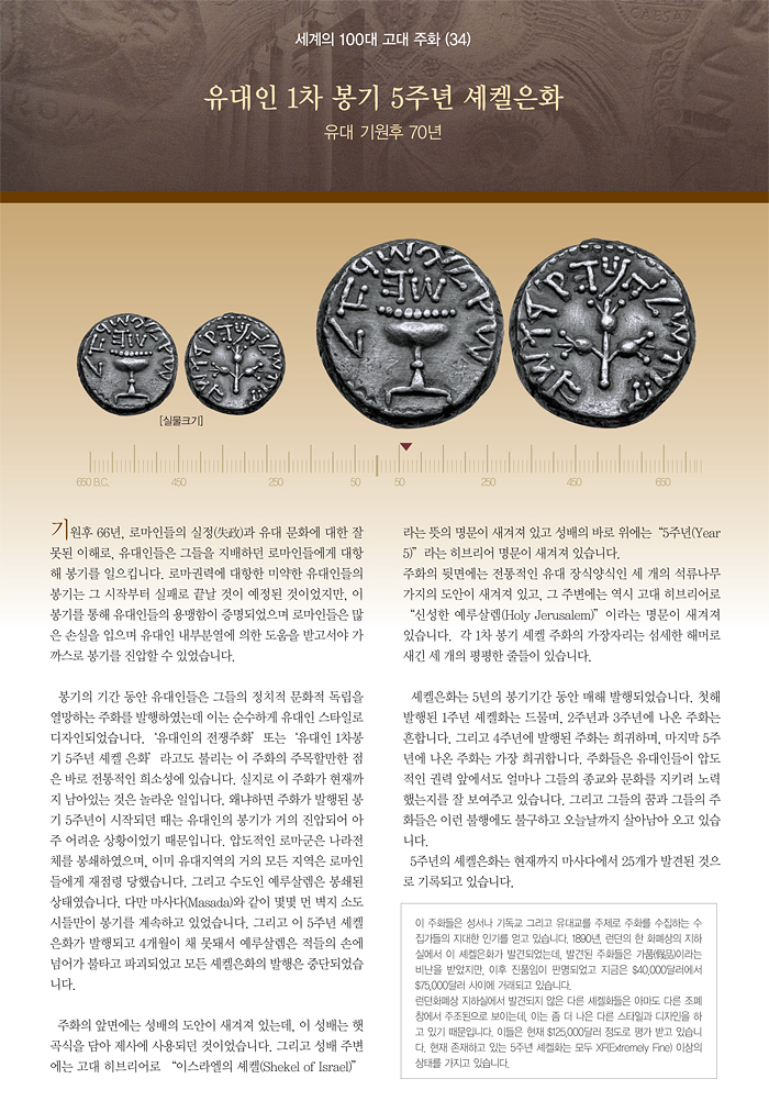 | 세계의 100대 고대 주화 (34) 유대인 1차 봉기 5주년 셰켈은화 | |||||