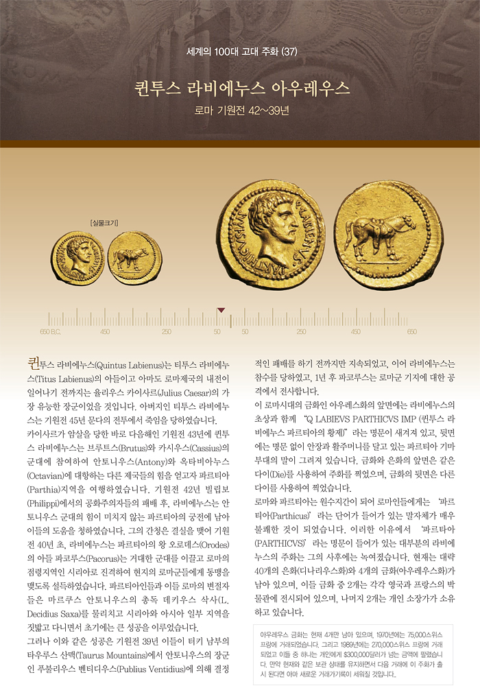 | 세계의 100대 고대 주화 (37) 퀸투스 라비에누스 아우레우스 | |||||
