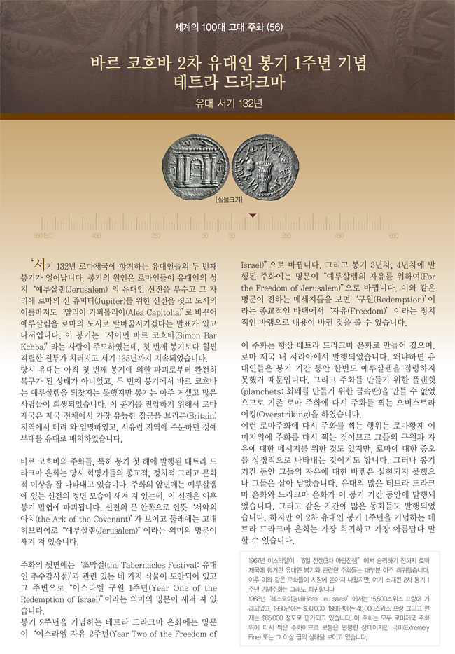 | 세계의 100대 고대 주화 (56) 바르 코흐바 2차 유대인 봉기 1주년기념 테트라드라크마 | |||||