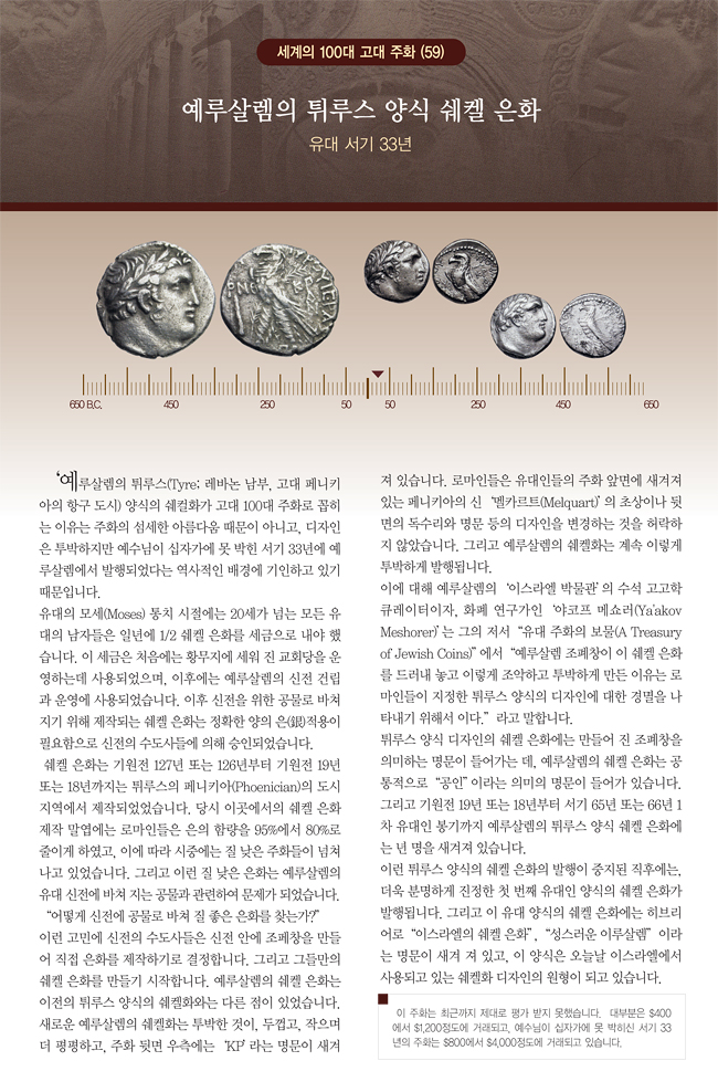 | 세계의 100대 고대 주화 (59) 예루살렘의 튀루스 양식 쉐켈 은화 | |||||