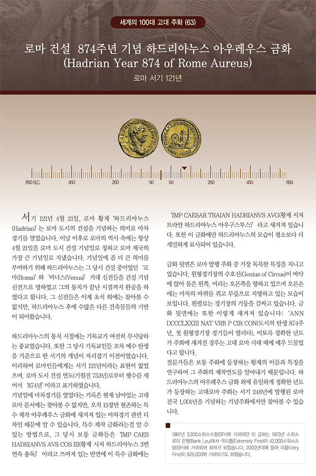 | 세계의 100대 고대 주화 (63) 로마 건설 874주년 기념 하드리아누스 아우레우스 금화 | |||||