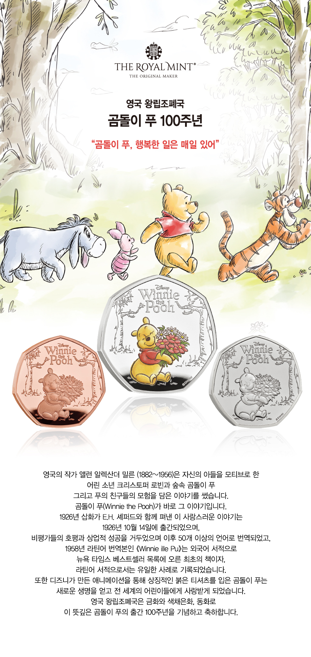 영국의 작가 앨런 알렉산더 밀른 (1882~1956)은 자신의 아들을 모티브로 한 어린 소년 크리스토퍼 로빈과 숲속 곰돌이 푸 그리고 푸의 친구들의 모험을 담은 이야기를 썼습니다. 곰돌이 푸(Winnie the Pooh)가 바로 그 이야기입니다. 1926년 삽화가 E.H. 셰퍼드와 함께 펴낸 이 사랑스러운 이야기는 1926년 10월 14일에 출간되었으며, 비평가들의 호평과 상업적 성공을 거두었으며 이후 50개 이상의 언어로 번역되었고, 1958년 라틴어 번역본인 《Winnie ille Pu》는 외국어 서적으로 뉴욕 타임스 베스트셀러 목록에 오른 최초의 책이자, 라틴어 서적으로서는 유일한 사례로 기록되었습니다. 또한 디즈니가 만든 애니메이션을 통해 상징적인 붉은 티셔츠를 입은 곰돌이 푸는 새로운 생명을 얻고 전 세계의 어린이들에게 사랑받게 되었습니다. 영국 왕립조폐국은 금화와 색채은화, 동화로 이 뜻깊은 곰돌이 푸의 출간 100주년을 기념하고 축하합니다.